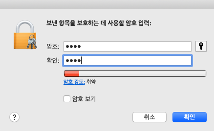 패스워드를 입력하고, 확인 버튼을 눌러 줍니다. 그리고 나온 맥 암호 입력 창에 암호를 입력하면, 키에 대한 p12 파일이 만들어 집니다.