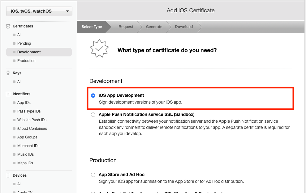 어떤 인증서 타입이 필요하냐고 묻는 창이 뜨면, iOS App Development를 선택하고 스크롤를 쭉 내려,