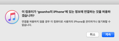 아이폰을 맥에 연결합니다. 그러면, IPhone 정보 연결 허용을 묻는 창이 뜨는 데 계속을 눌러 줍니다.