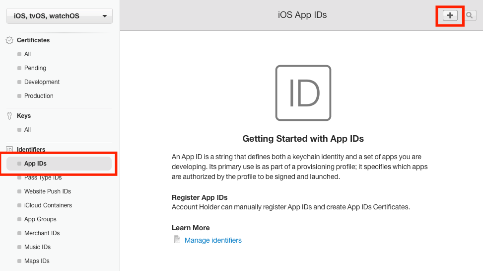 왼쪽 메뉴에서 App IDs를 선택하고, 오른쪽 상단의 + 버튼을 눌러 줍니다.
