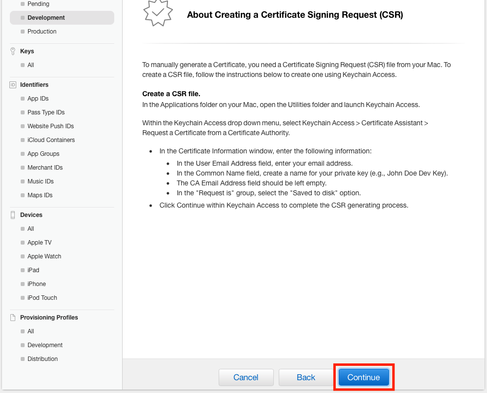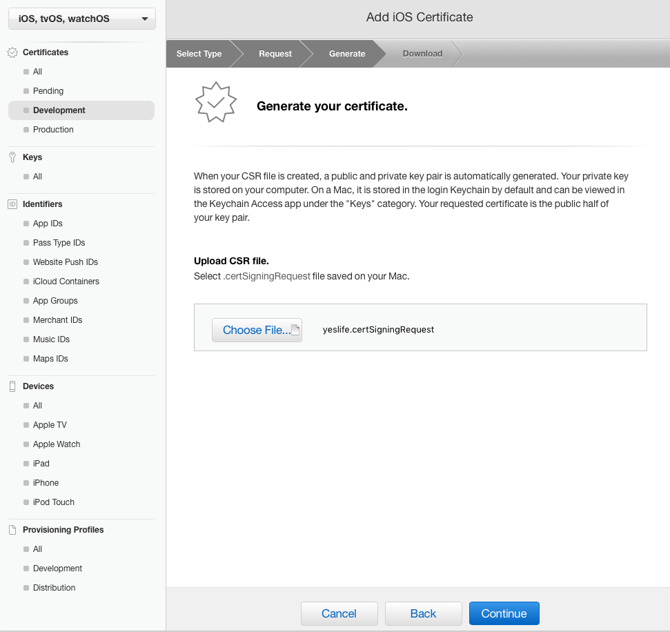 개발용 Push Notification 파일을 선택하고, Continue 버튼을 눌러 주도록 합니다.