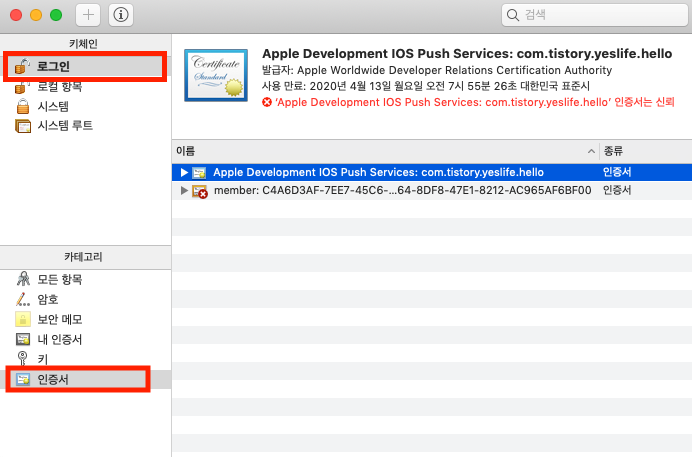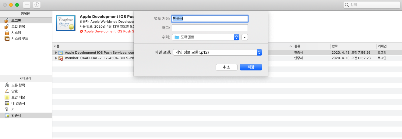 먼저, APs 인증서를 내보내기 해 p12 파일을 만들어 주도록 합니다. 키 인증서를 열고 키체인은 로그인, 카테고리는 인증서를 각각 선택해 줍니다.