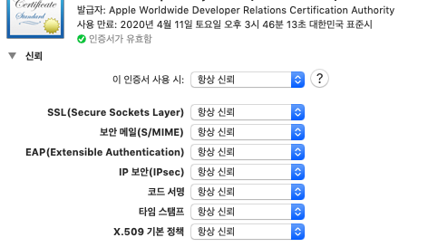 그리고, 앱 Failed with exit code 1 오류가 계속 난다면, 키체인의 인증서를 두번 눌러 뜬창에서, 인증서를 눌러, 신뢰를 표시한뒤, 모두 항상 신뢰를 눌러 줍니다.