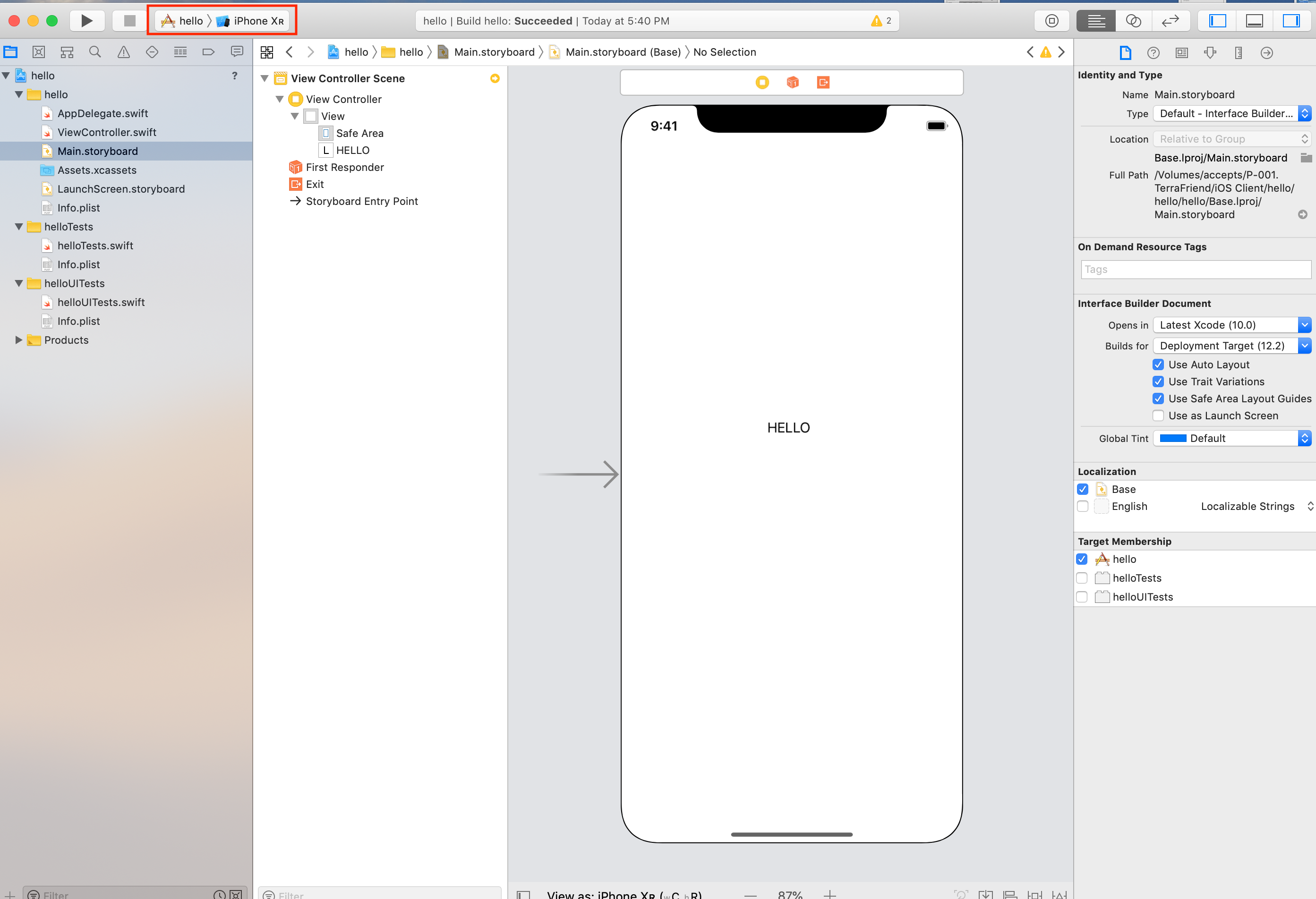 프로젝트가 생성되면, 스토리 보드에서 다음과 같이, HELLO를 입력합니다. (원한다면, 이 상황에서 시뮬레이터를 통해 앱을 실행해 봐도 상관이 없습니다.)