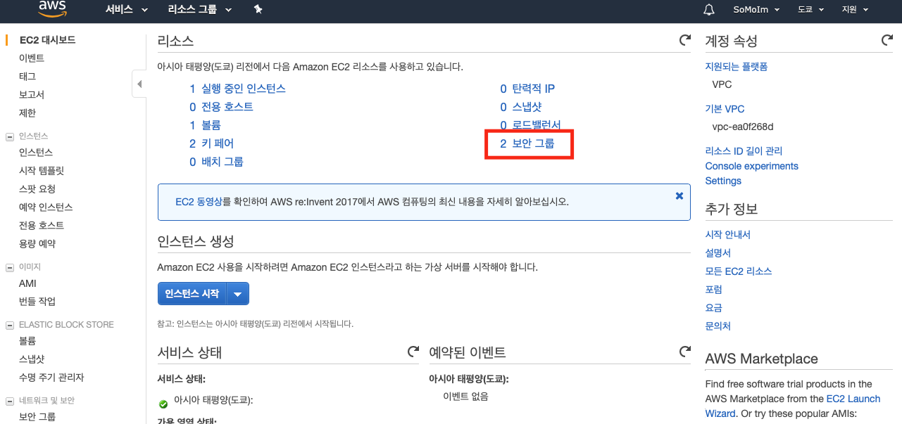 - 리소스화면이 나타나면, 보안그룹을 선택해 줍니다.