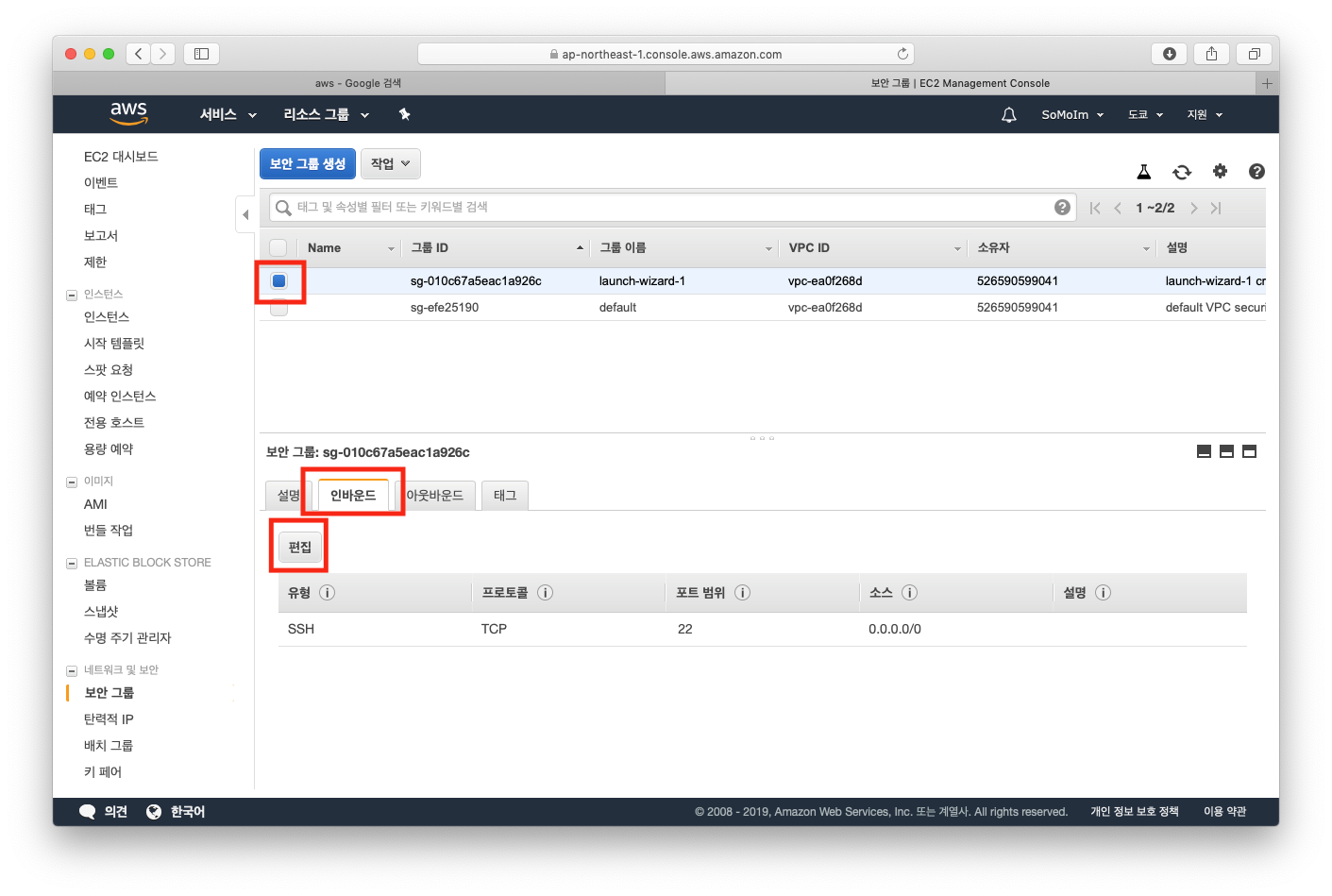 다시 보안 그룹으로 돌아와 포트를 열어 둡니다.