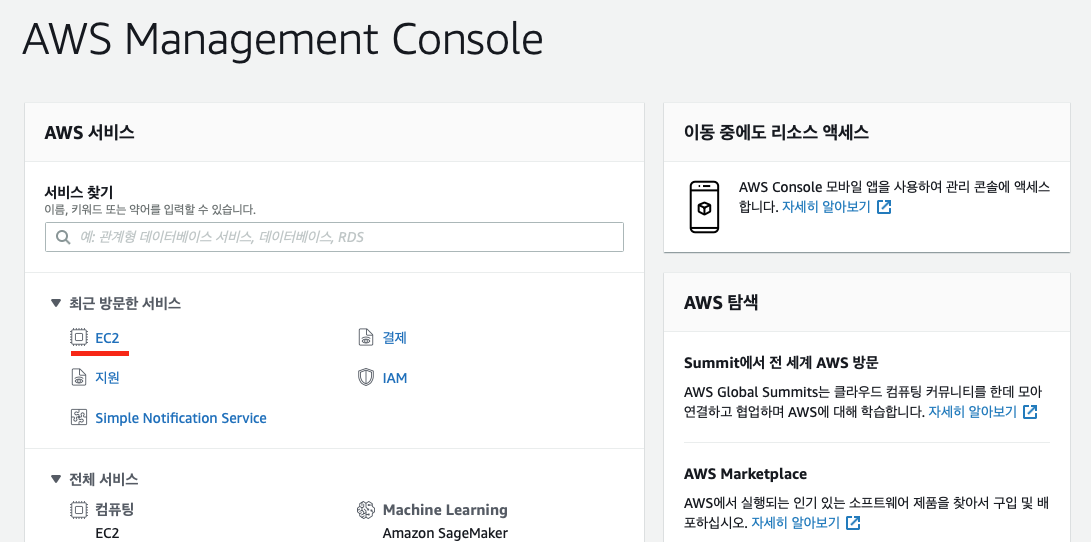 - 콘솔에 접속 후 EC2 서비스를 눌러 줍니다.