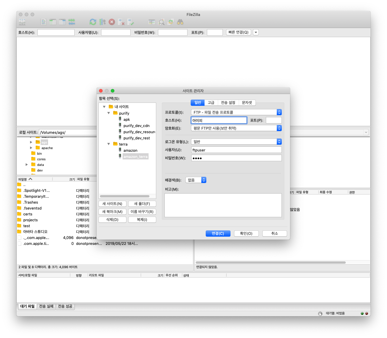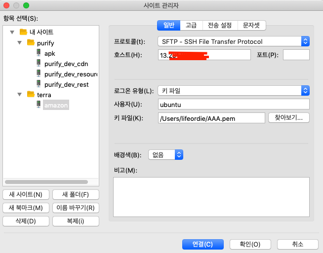파일 질라에서 아래와 같은 요령으로 접속을 합니다.