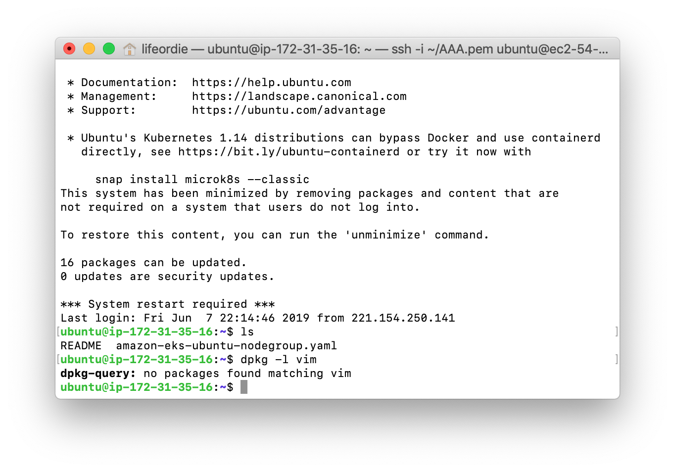 - 먼저 우분투에 접속하기 위해 ssh를 켭니다. 그리고, 키 페어를 이용해 로그인합니다. (키페어 관련은 따로 다루지 않습니다.).