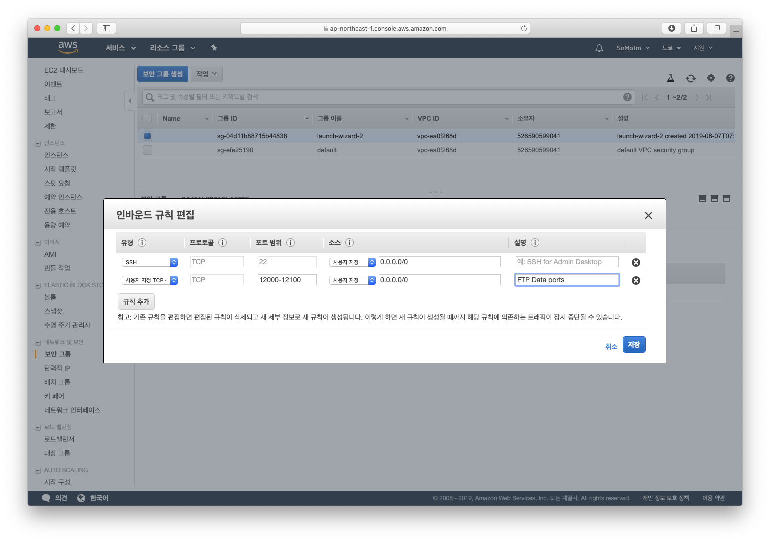 id-password 방식은 데이터를 주고 받을 포트를 따로 열어야할 필요가 있습니다. 앞서 열어둔 22번 포트는 로그인등 명령을 주고 받을 때만 사용합니다. 저는 AWS 사용해 이것으로 설명을 하지만, 여러분들은 상황에 맞게 방화벽등의 포트를 열어 두시면되겠습니다.