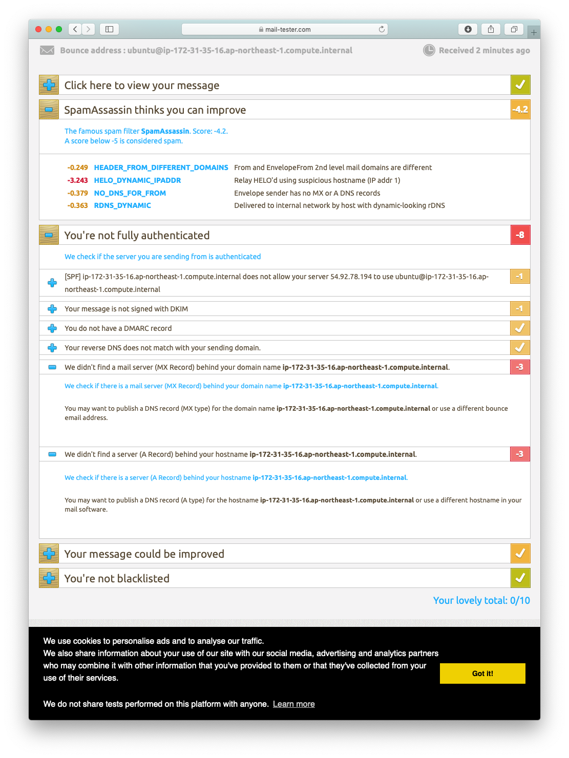 sendmail만 설치하고, 메일을 보냈다면, 다음과 같은 결과를 보게 될 것 입니다. 10점 만점에 -12.2 (센스 있게 0점으로 표시해 주더군요.)