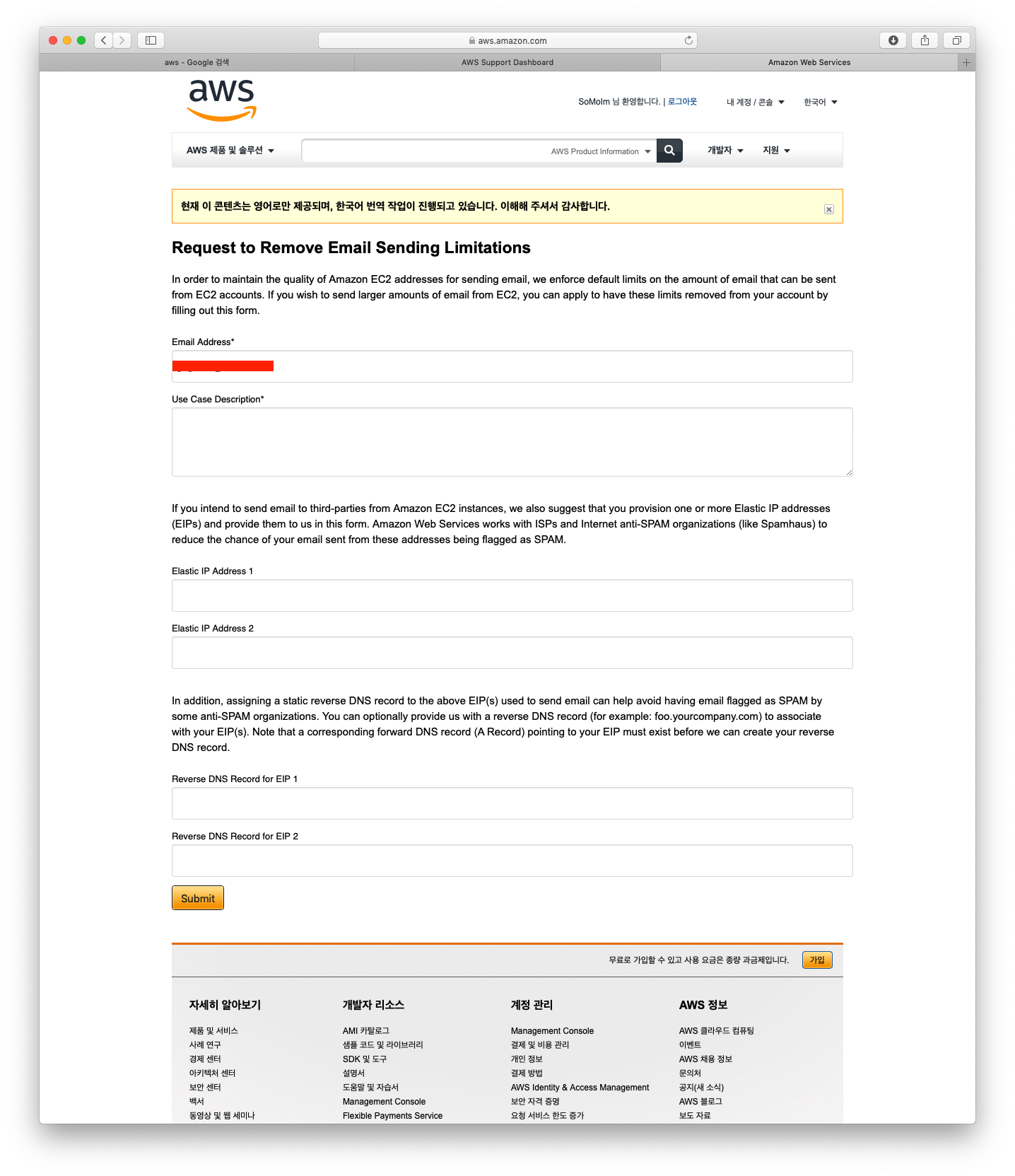 먼저, aws에 지원에 리버스 도메인 신청서 제출 방법을 물었고, 아마존에서는 다음과 지원서 작성 양식폼의 주소를 알려 주었습니다. https://aws.amazon.com/forms/ec2-email-limit-rdns-request .