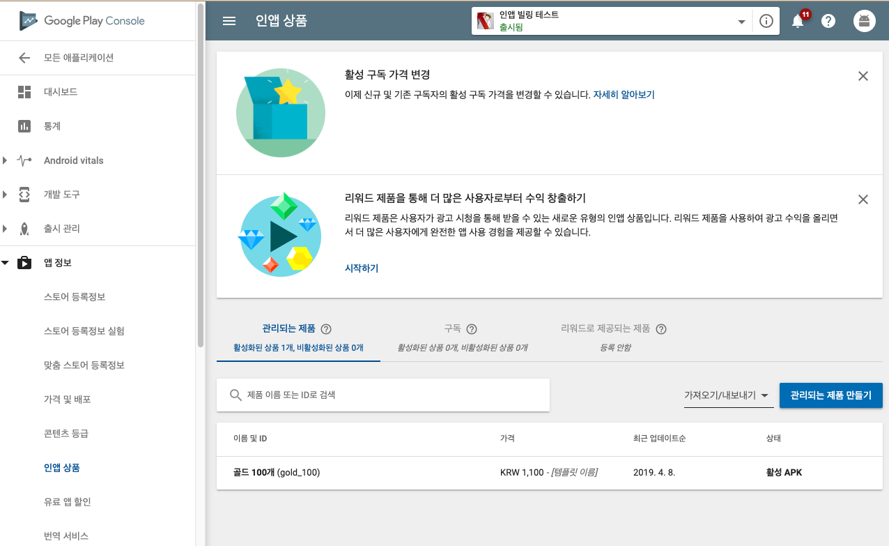 다시 왼쪽 메뉴의 앱정보 > 인앱 상품을 선택하면, 상품이 추가된 것을 볼 수 있습니다.