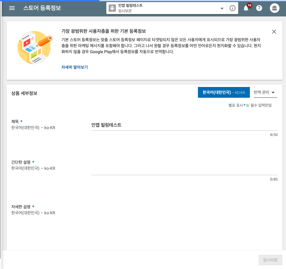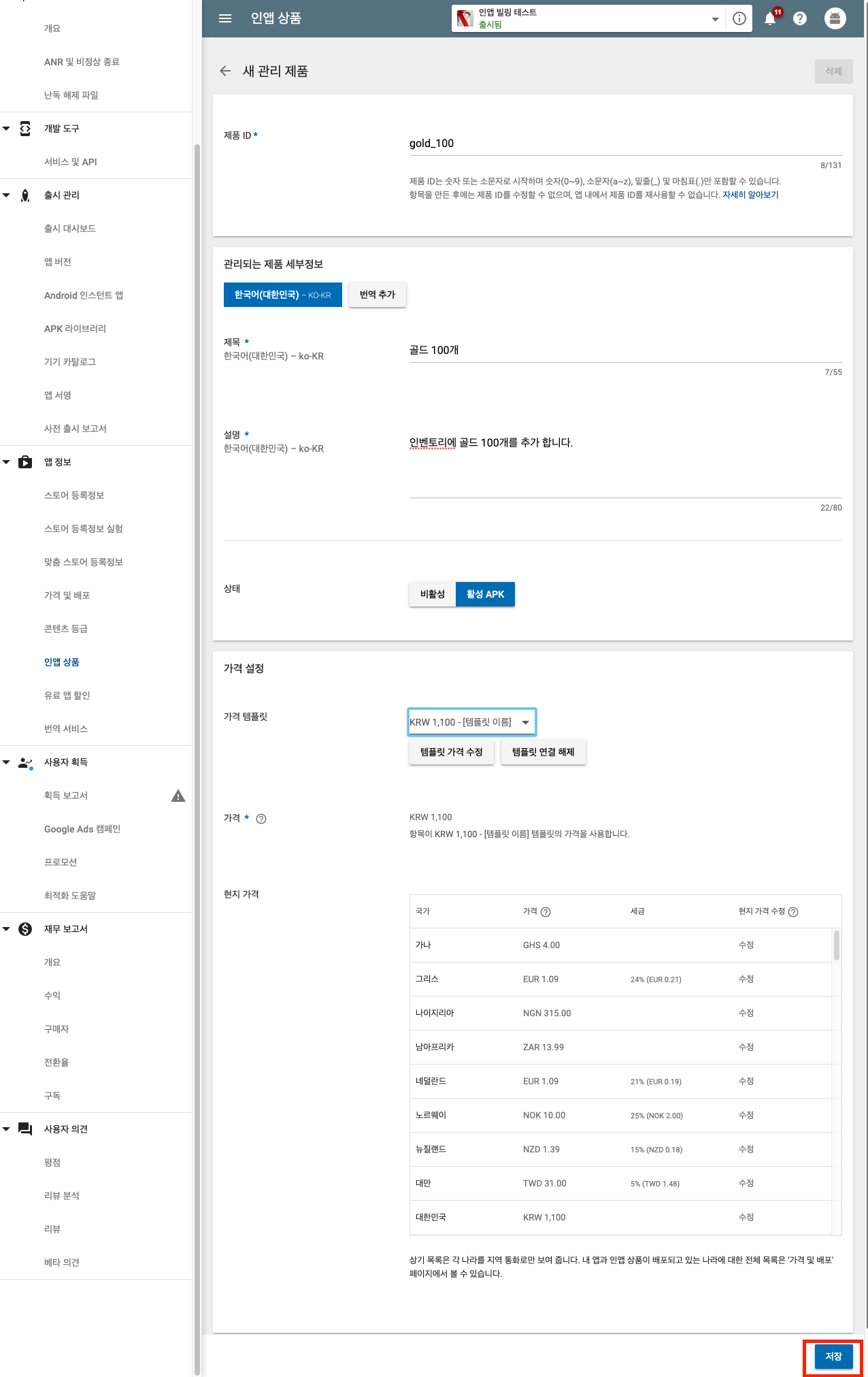 관리되는 제품 > 관리되는 제품 만들기를 차례로 눌러, 아래와 같이 1회성 상품을 등록할 수 있는 페이지를 호출 합니다. 호출된 페이지에서, 적당한 값을 넣어, 상품을 만들어 줍니다. 주의 할 점은 상태 값인데, 활성 APK 상태로 두어야 상품이 구매 가능한 상태가 됩니다. 모든 값을 입력했다면, 저장 버튼을 눌러 줍니다.