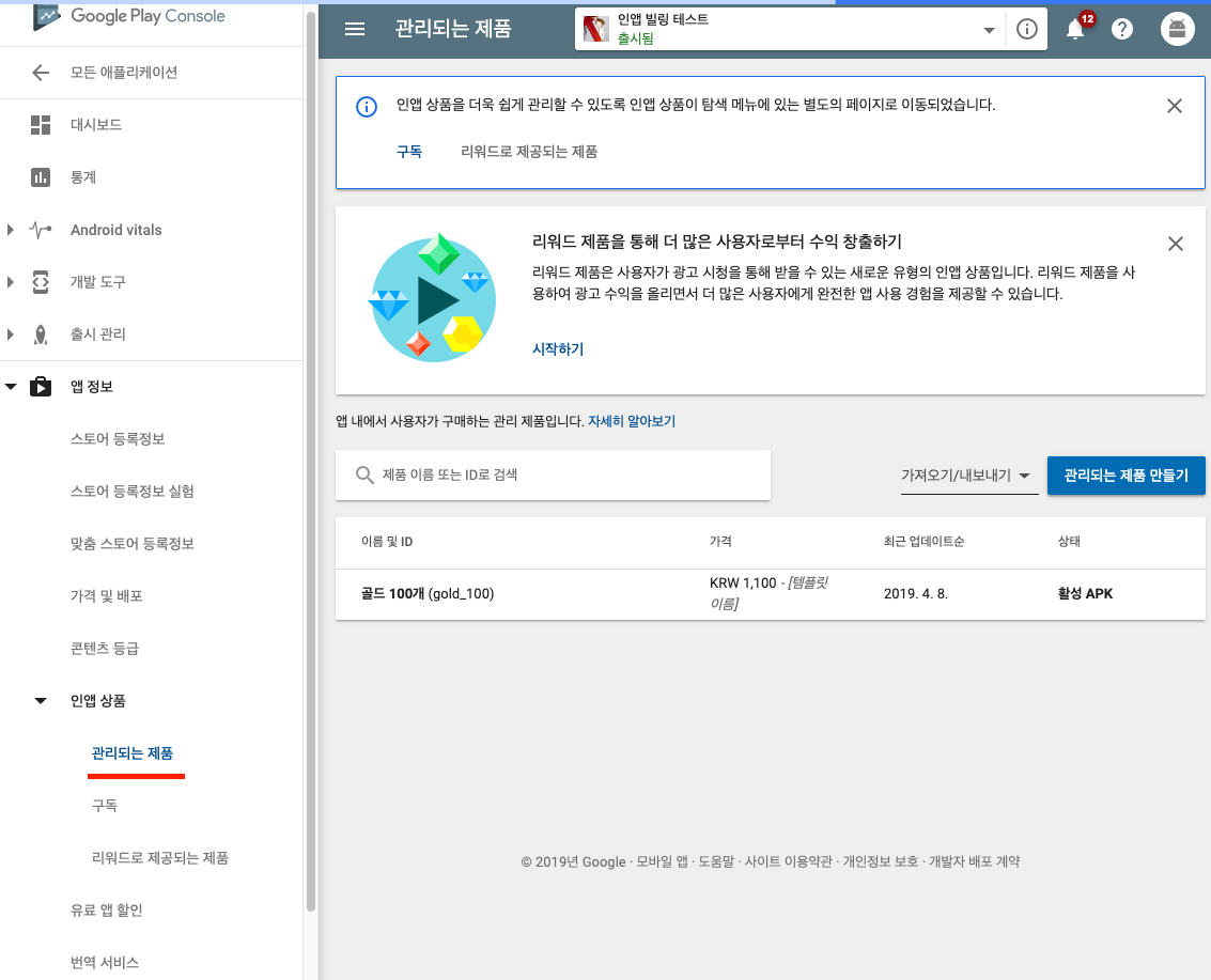 구글 플레이 콘솔로가 등록된 상품들의 정보를 확인합니다. (물론 자신이 등록했으므로, 알고 있을 경우, 굳이 확인하지 않아도 됩니다.) 구글 플레이 콘솔 접속, 왼쪽메뉴에서 앱 정보 > 인앱 상품 > 관리되는 제품을 차례로 선택하면 등록된 상품을 확인할 수 있습니다.