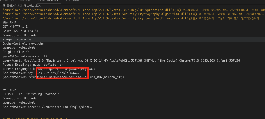 받은 로그를 보면, 또 아래와 같은 메시지가 나옵니다. 중요한 부분은 Sec-WebSocket-Key 부분입니다. 클라이언트가 매번 바꿔 보내 줍니다. 이 값을 활용해 데이터 보낼때 사용합니다.