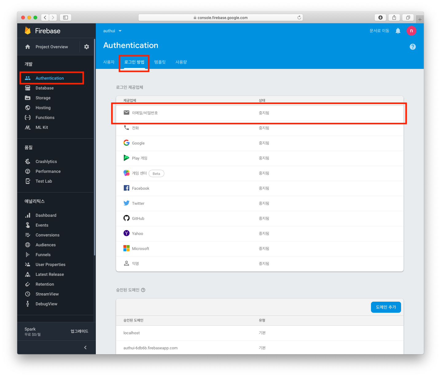 일단 이메일/비밀번호를 사용해 로그인할 수 있도록 설정하겠습니다. 관리자 콘솔에서 Authentication을 선택하고, 로그인 방법 탭을 선택한 후 이메일/비밀번호를 선택합니다.