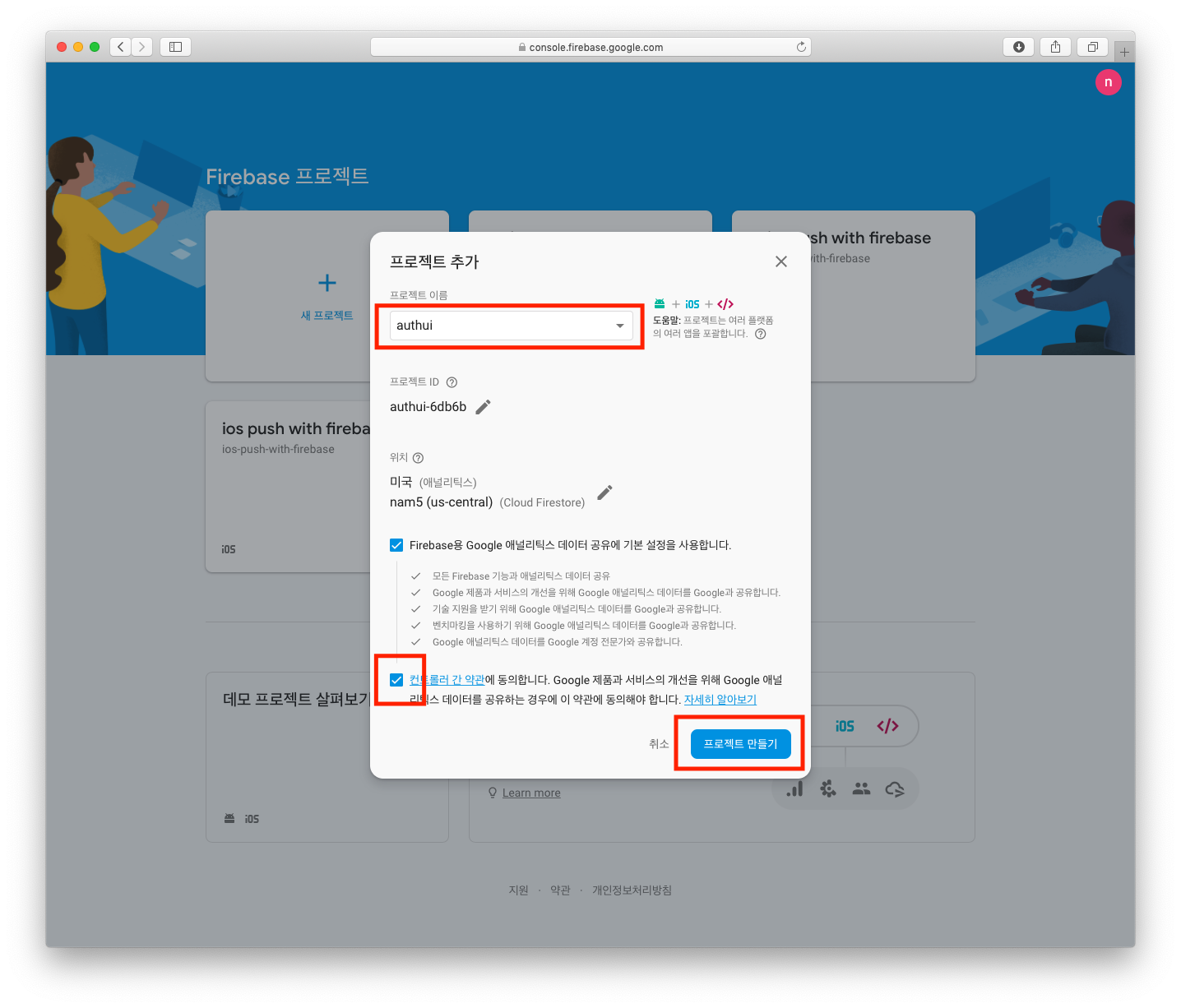 프로젝트 추가 창이 뜨면, 프로젝트 이름을 적고 프로젝트 만들기 버튼을 눌러 주도록 합니다.