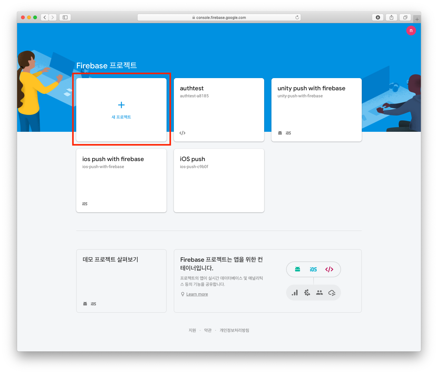 먼저 파이어 베이스 프로젝트를 추가하겠습니다. 파이어 베이스 콘솔페이지에서, 새 프로젝트를 선택합니다.