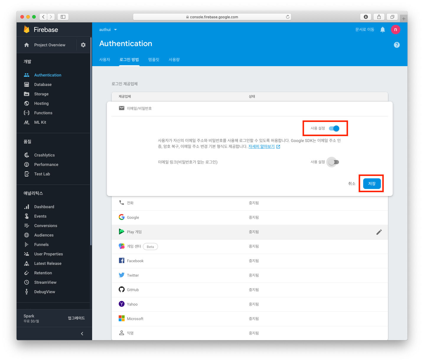 아래와 같이 [이메일/비밀번호]에 사용설정을 한 후 저장 버튼을 눌러 주도록 합니다. (상단 하나만 활성화 합니다.)