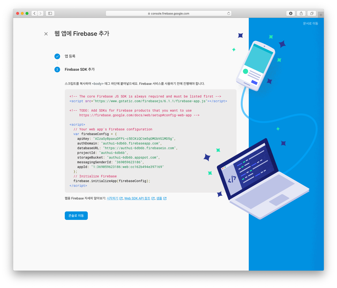 그러면, 파이어 베이스 설정 코드를 붙여 넣어 파이어베이스 SDK를 초기화 할 수 있도록 해 줍니다. 사용할 웹페이지의 Head 태그 사이에 붙여 넣도록 합니다.