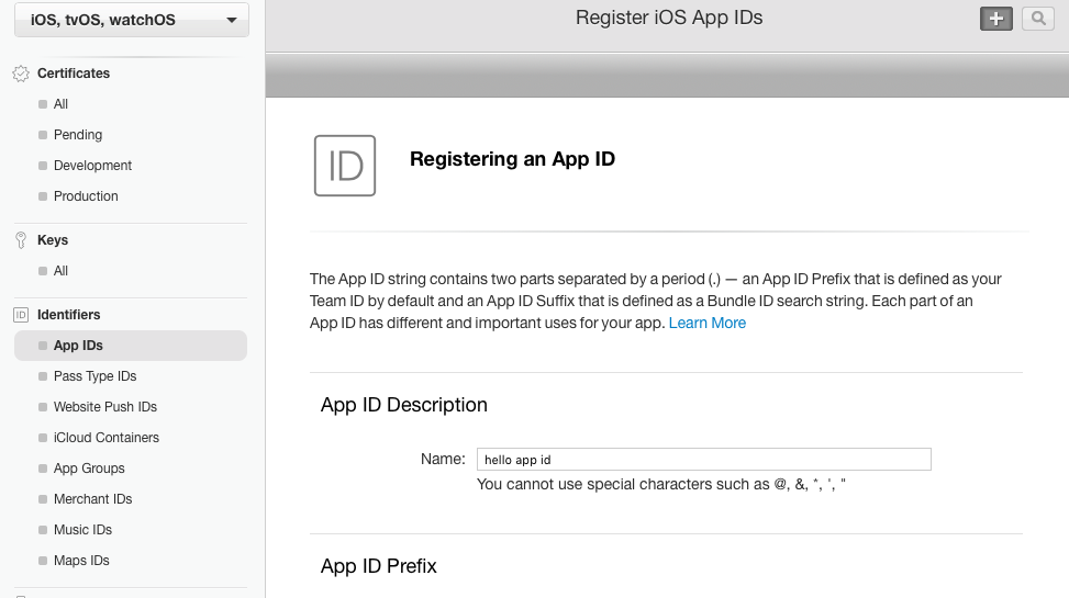 앱등록 항목이 뜨면, xcode를 만들때 입력한 iOS와 일치하는 번들 ID를 입력하도록 합니다. 그리고, 앱 등록 버튼을 눌러 주도록 합니다.