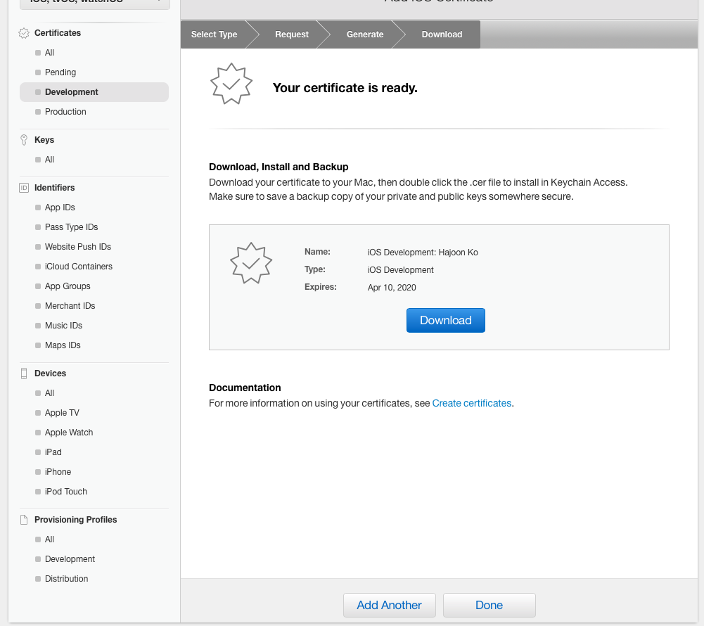 생성하면, 아래와 같은 화면이 나옵니다. Download를 눌러 키를 다운로드 하고, Done 키를 눌러 종료 하도록 합니다.