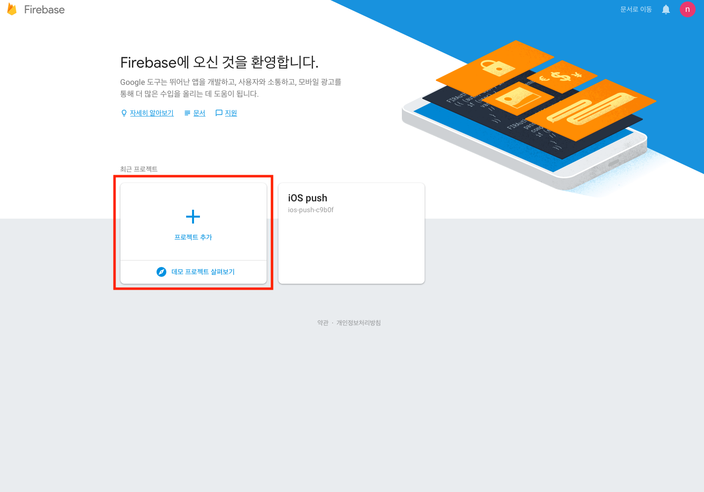 콘솔 첫 화면에서 프로젝트 추가 버튼을 눌러 주도록 합니다.