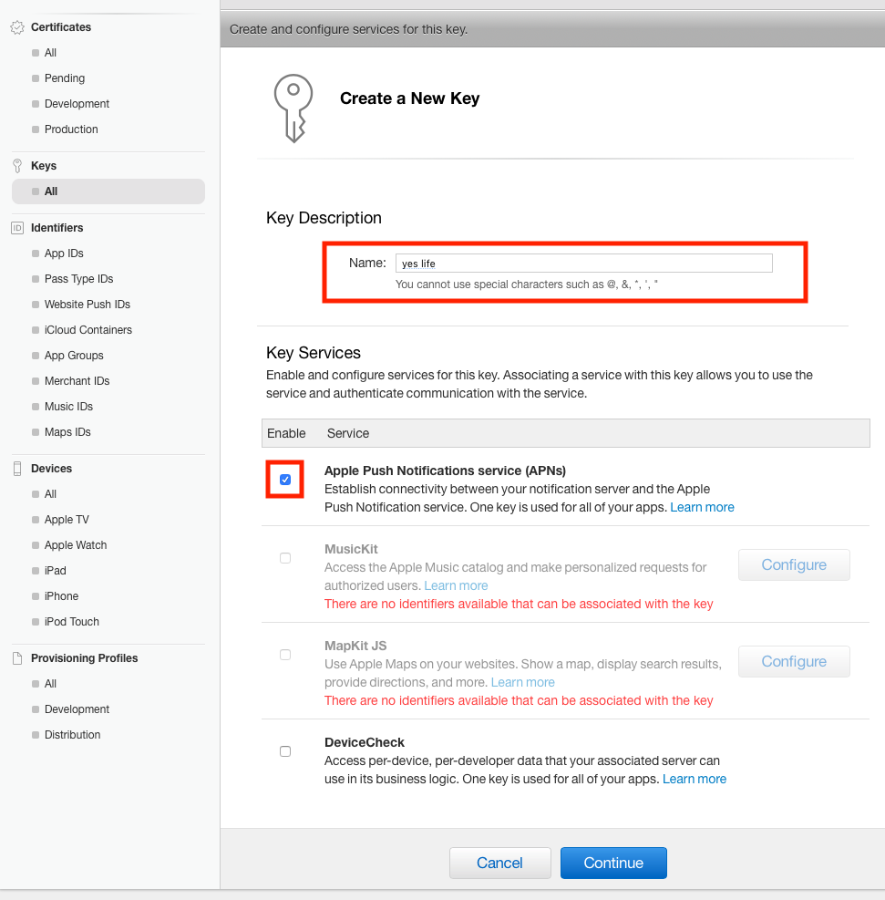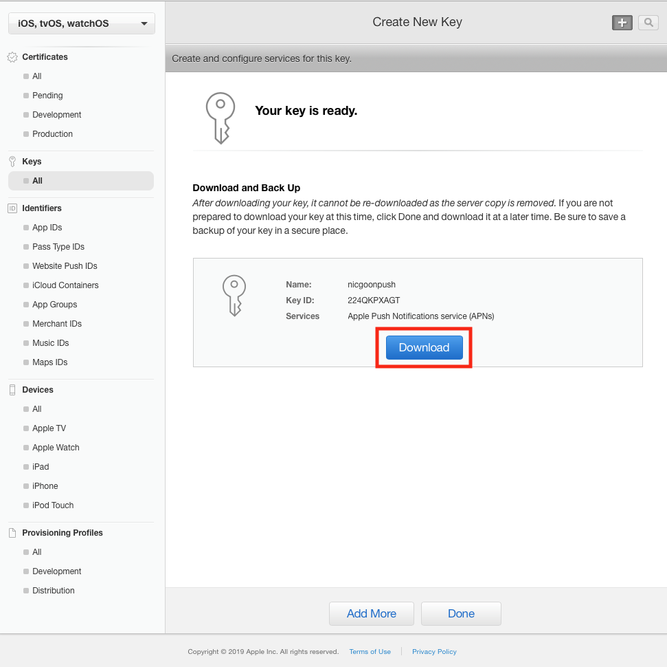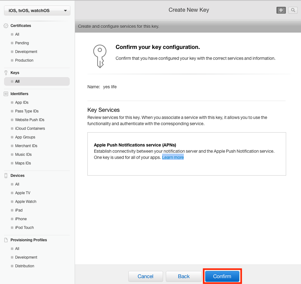 메시지를 iOS에 발신하기 위해서는, APN 키가 필요합니다. 애플 개발자 사이트로 접속해 Certificates, Identifiers & Profiles 로 이동합니다. 여기서 왼쪽 메뉴 중 Keys > All을 선택합니다. 그리고, + 버튼을 눌줍니다.