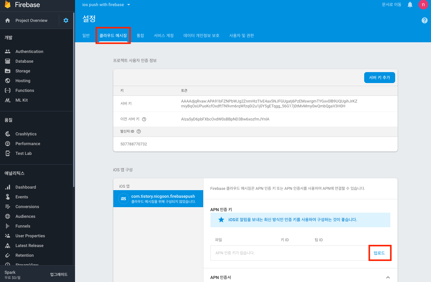 설정키에서 클라우드 메시징 탭을 선택하고, APN 인증 키의 업로드 버튼을 선택해 줍니다.