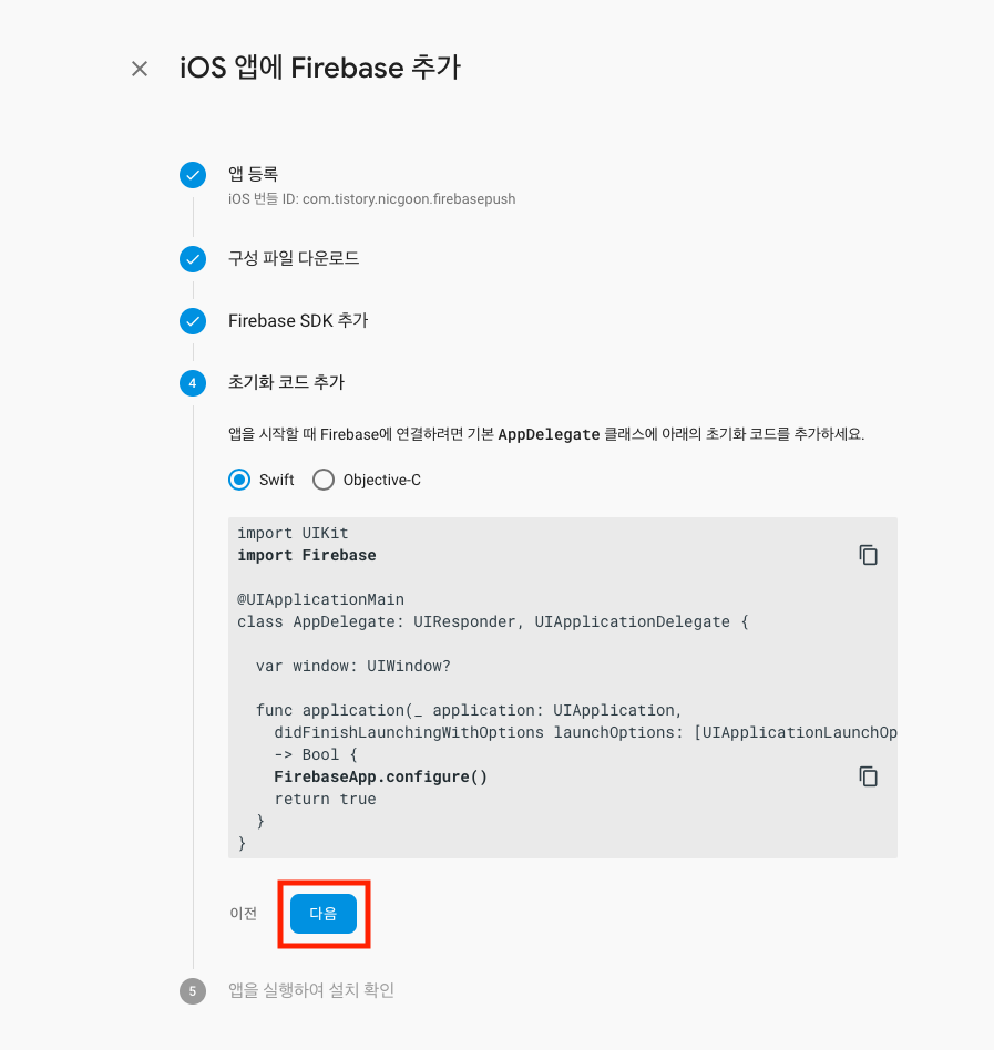 구성 파일 다운로드 항목에서는 시키는 대로 android, iOS 를 위한 설정 파일을 다운로드 받아 적당한 위치에 배치 합니다. 그리고 다음 버튼을 눌러 주도록 합니다.