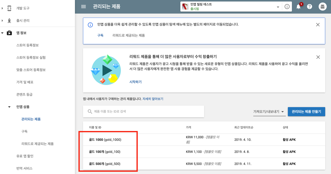 구글 상품을 구매하기 위해서는, 앱을 한 번 생성해 알파 혹은 베타 버전으로 등록한 후, 상품을 등록해야 합니다. 등록한 상품들은 아래 페이지에서 확인할 수 있으며, 상품아이디들을 메모해 둡니다.