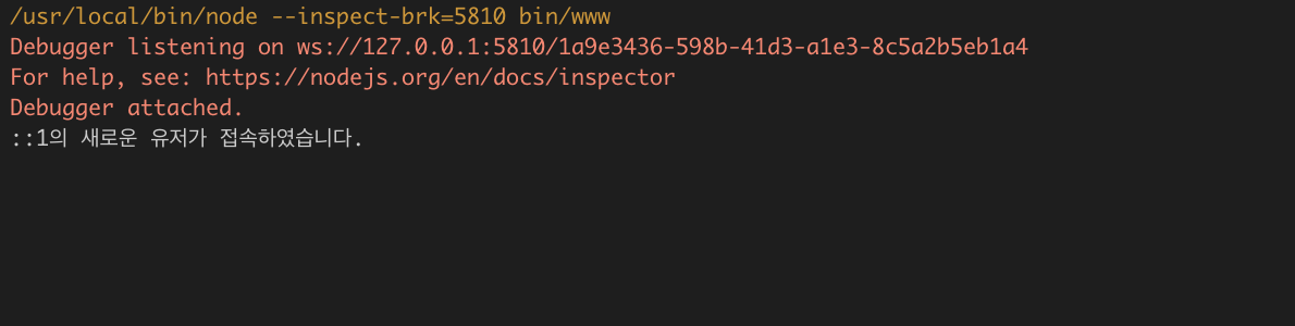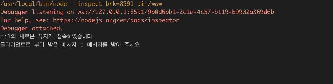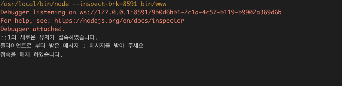 브라우저에서 위의 소스를 실행하면, node.js에 아래와 같은 메시지를 볼 수 있습니다. (자동으로 바로연결됨)